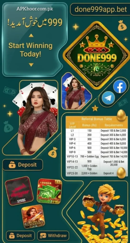 The Done 999 game is a casino-style application where there are many casino games to play. Players can select any game that they understand or can play a game that they like. They have to place small bets and earn money online. The game has simple gameplay and can be played by beginners easily and effortlessly. The game also supports all the localized payment methods (Jazz Cash, Easy Paisa, ete).