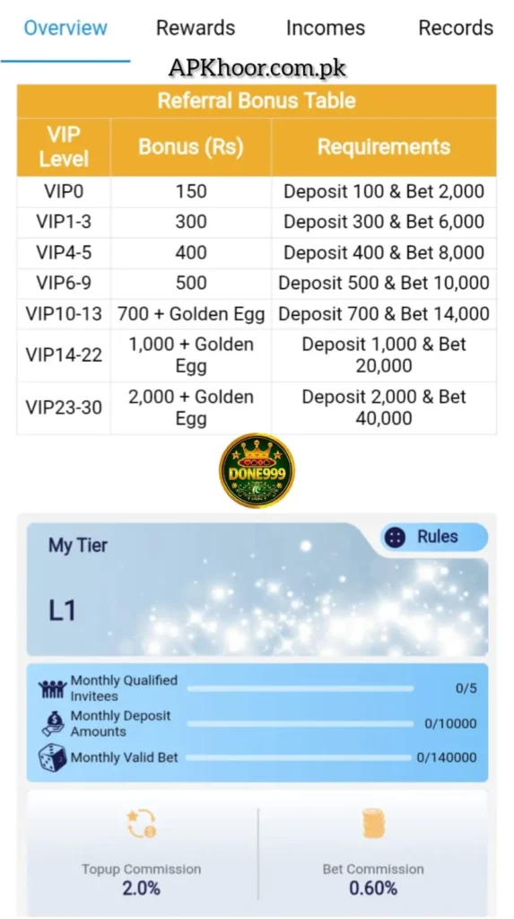 Overall, the Done999 game is one of the best and easiest sources to generate an income. The game has simple gameplay, a user-friendly interface, and eye-catching graphics. Many people love to play games in this application because of the easy gameplay of the game. This casino app provides an opportunity to win huge rewards and profits.